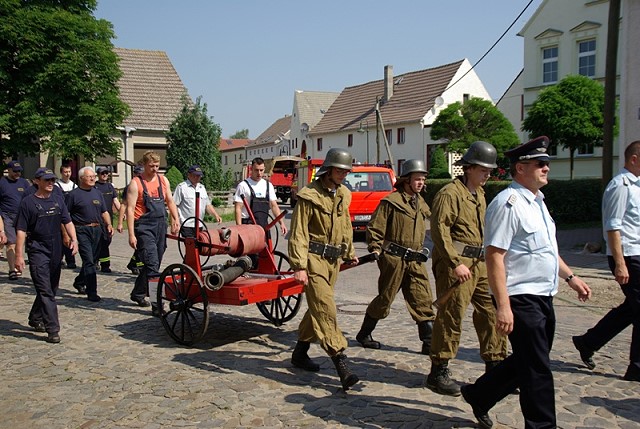 Die jungen Kameraden Tobias Ladebeck, Morten Drüsedau und Daniel Hardtke haben die alten DDR- Kombis angezogen und ziehen eine eigens durch sie für diesen Anlass restaurierte B-Haspel.