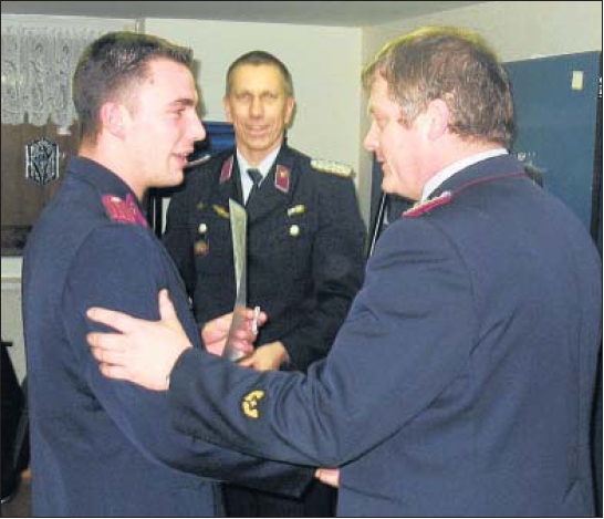 Wehrleiter Rainer Heinrich und Kreisbrandmeister Thomas Warnecke (rechts) bei der Beförderung von Peter Schulze (links) zum Feuerwehrmann. Foto: Feuerwehr