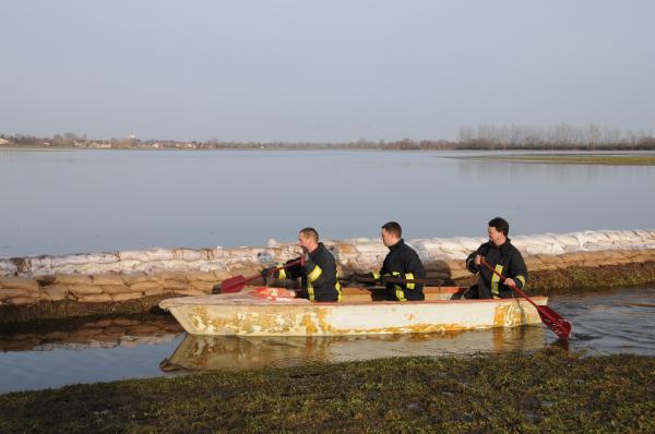 Das gab es schon sehr lange nicht mehr: Robert Meyer, Peter Schulze und Christian Nesemann (v.l.) fahren mit dem Kahn über den Acker. Pömmeltes Feuerwehr transportierte die Sandsäcke mit zwei Booten.